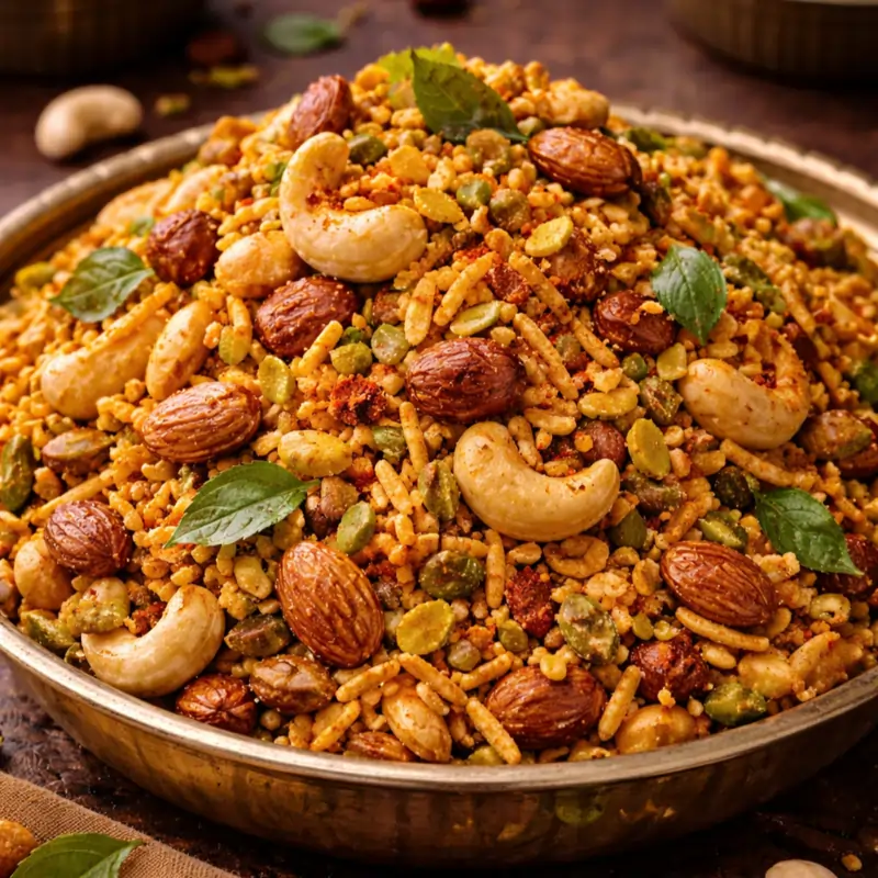 A crunchy and savory snack made with spiced lentil flour pearls, roasted Cashew, peanuts, and aromatic seasonings