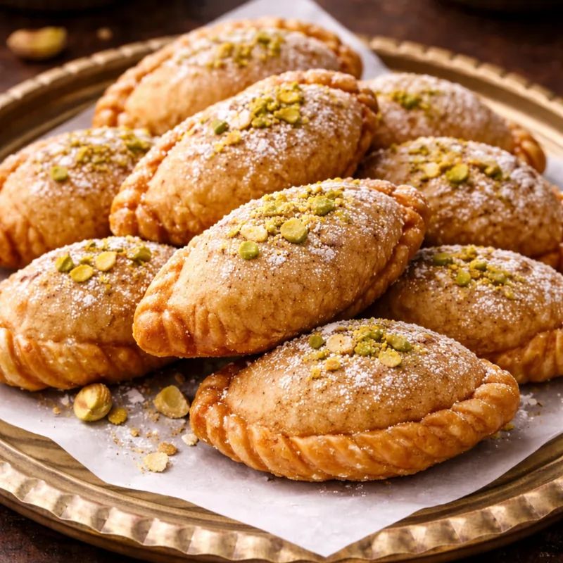 Crispy outer shell filled with rich khoya (kova) stuffing. A royal festive sweet with authentic taste